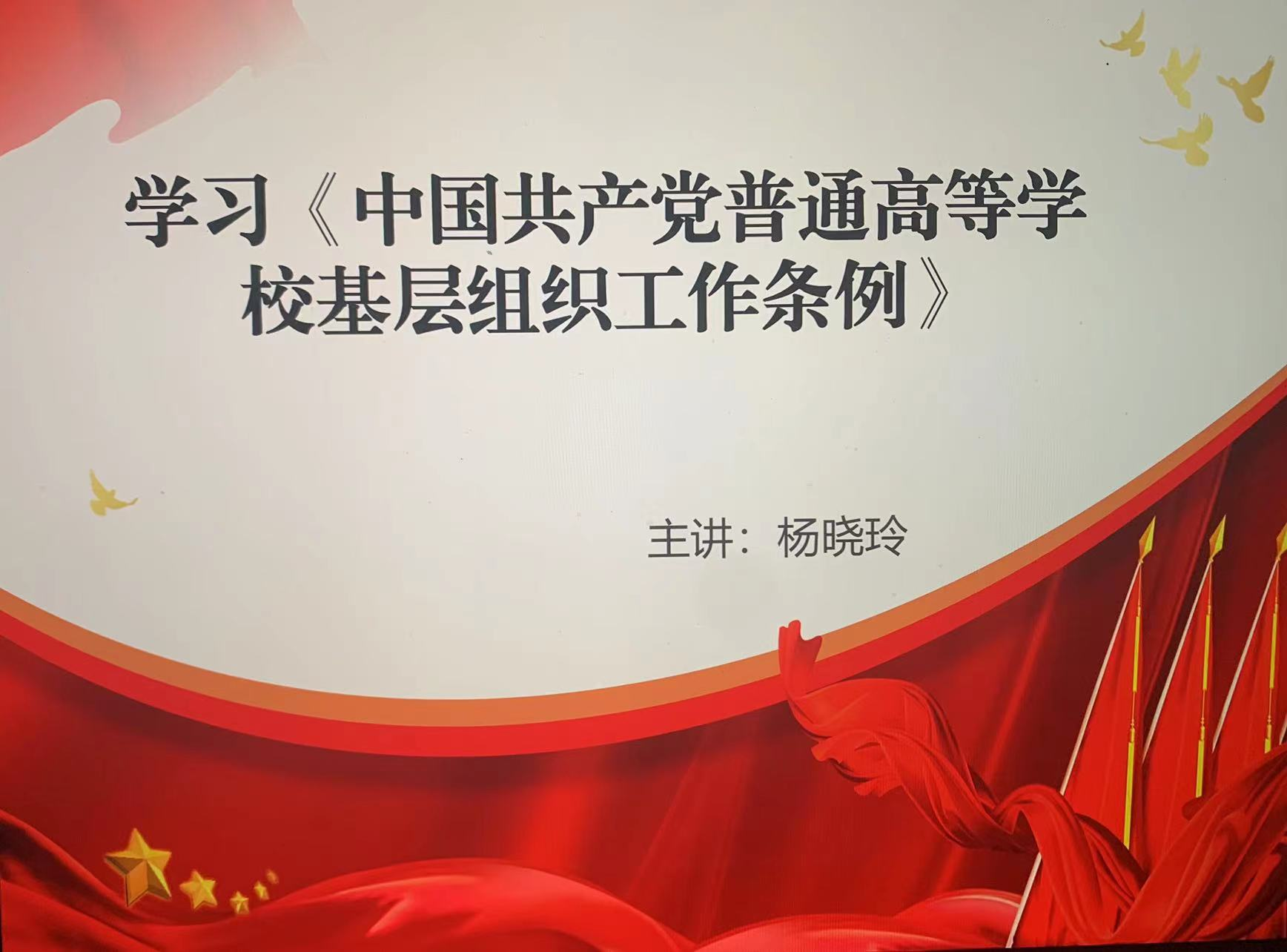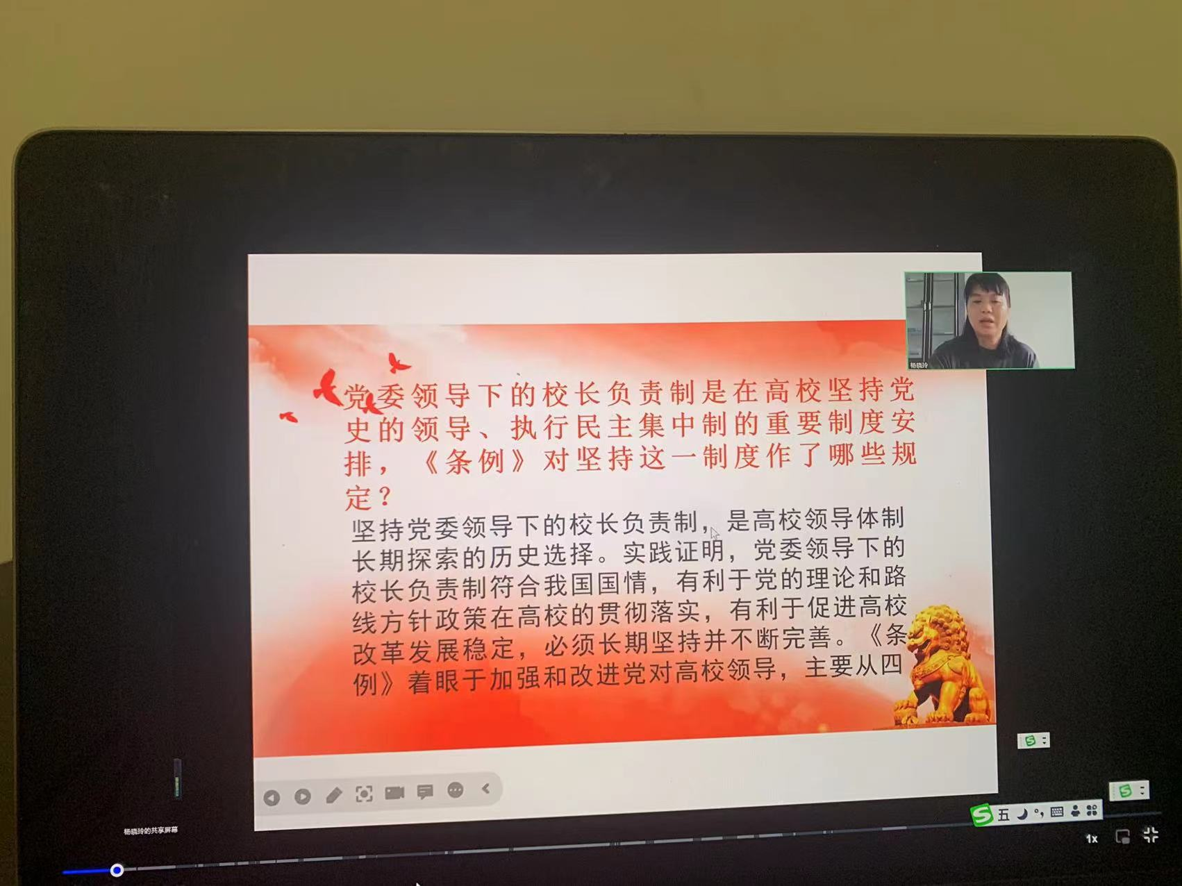 为开展好学习党内政策法规贯彻落实年活动,旅游财经学院党支部书记杨晓玲带头讲党课,党课题目为“学习《中国共产党普通高等学校基层工作条例》”。时间:2022年10月15日;由于疫情党课形式采取腾讯会议线上方式进行。目前党课已圆满完成,取得了良好的效果。