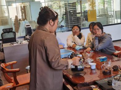 在勐伦仓,师生们受到了企业的热情接待。同学们沿着茶叶的生命线,系统参观了现代化的生产线与专业化的生、熟茶陈化仓。企业负责人为师生们深度解读了其品牌核心的 “3OLD”品控理论——Old Place(核心产地)、Old Tree(百年古树)、Old Year(五年陈化),并详细介绍了确保普洱茶“越陈越香”的科学仓储管理“八大措施”。