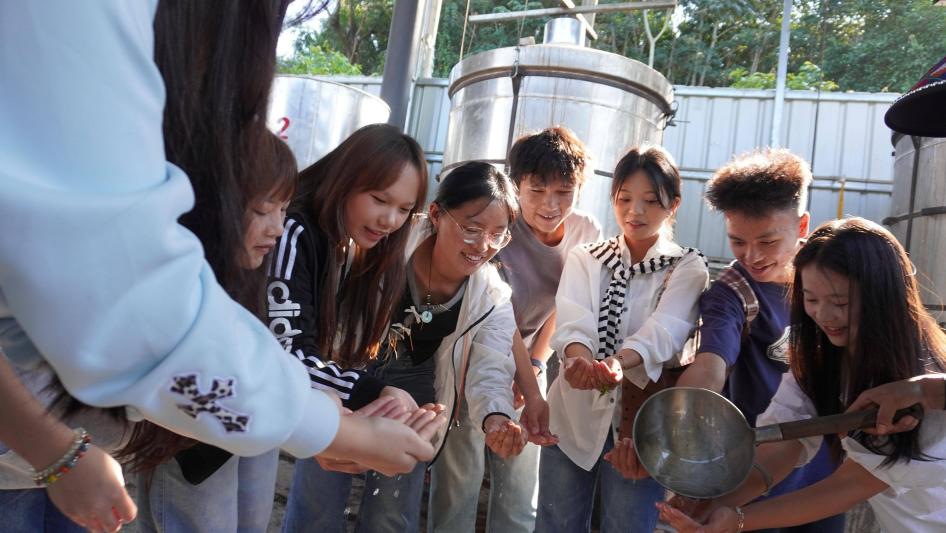在“阿里姐姐”的带领下,同学们深入体验了跳蚤草从植物到产品的奇妙旅程。大家不仅首次亲眼目睹了跳蚤草精油的古法炼制过程,更亲手参与了筛选、晾晒等初加工环节。这次体验让同学们深刻认识到,直播电商的货架上,不仅可以有标准化的工业品,更可以有承载着故事、文化与手工温度的非遗产品。