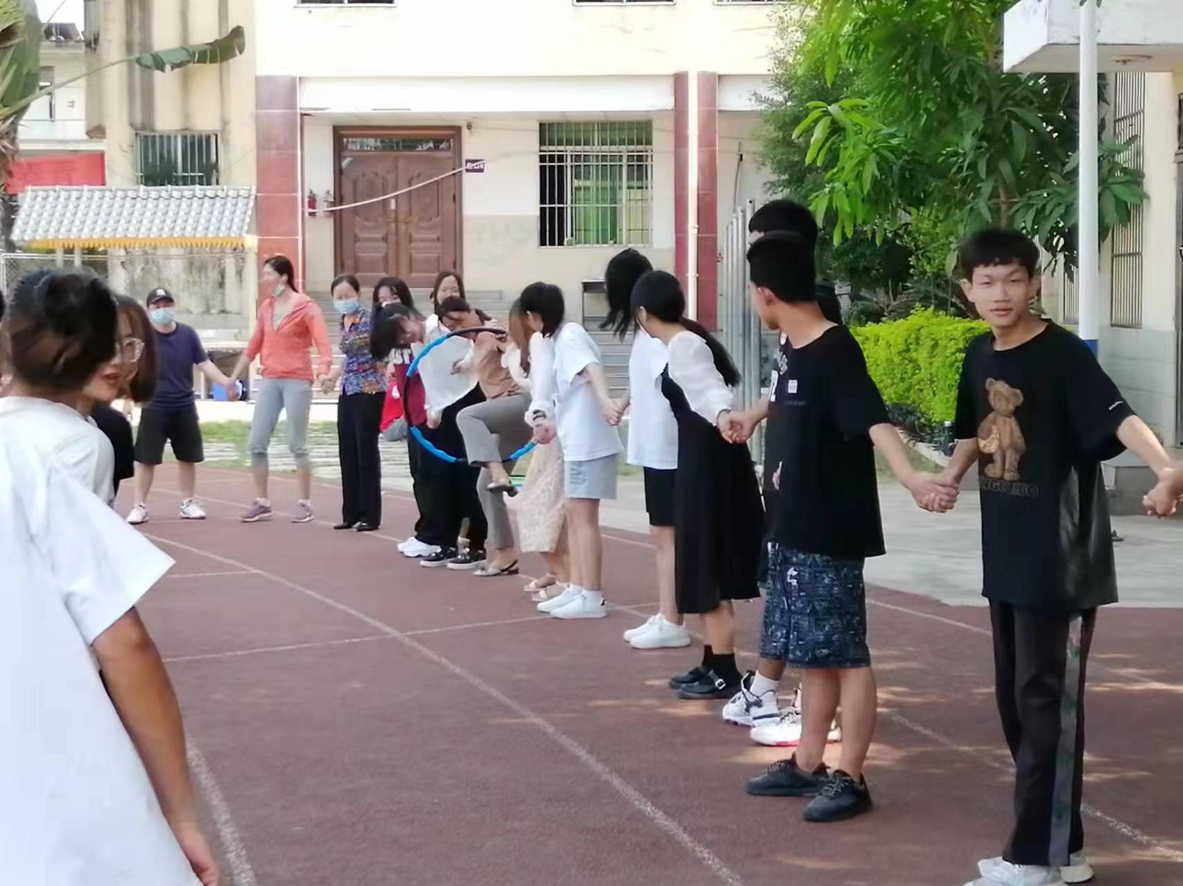 在疫情防控形式如此严峻的情况下,党员教师和入党积极分子、学生干部,都有巨大的精神压力,为了缓减师生压力,提升工作和学习热情,新老校区同时开展了两人三足、蒙眼信任走、传递面粉、串符拉圈等活动。