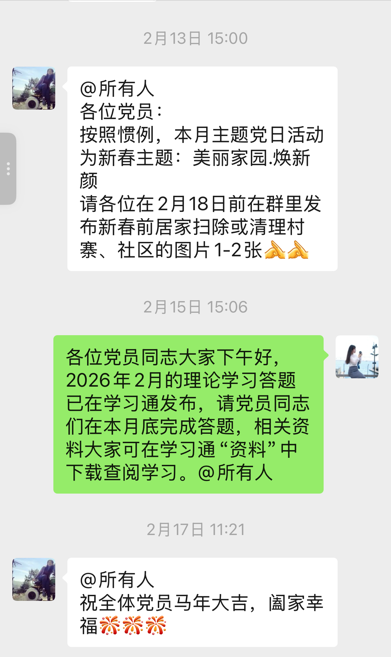 为营造整洁祥和的新春氛围,发挥党员先锋模范作用,近日,2026年2月中旬,国际交流学院党支部以“美丽家园·焕新颜”为主题,依托支部微信群开展线上主题党日活动,以分享交流的形式,组织全体党员参与环境整治,以洁净面貌迎接新春。