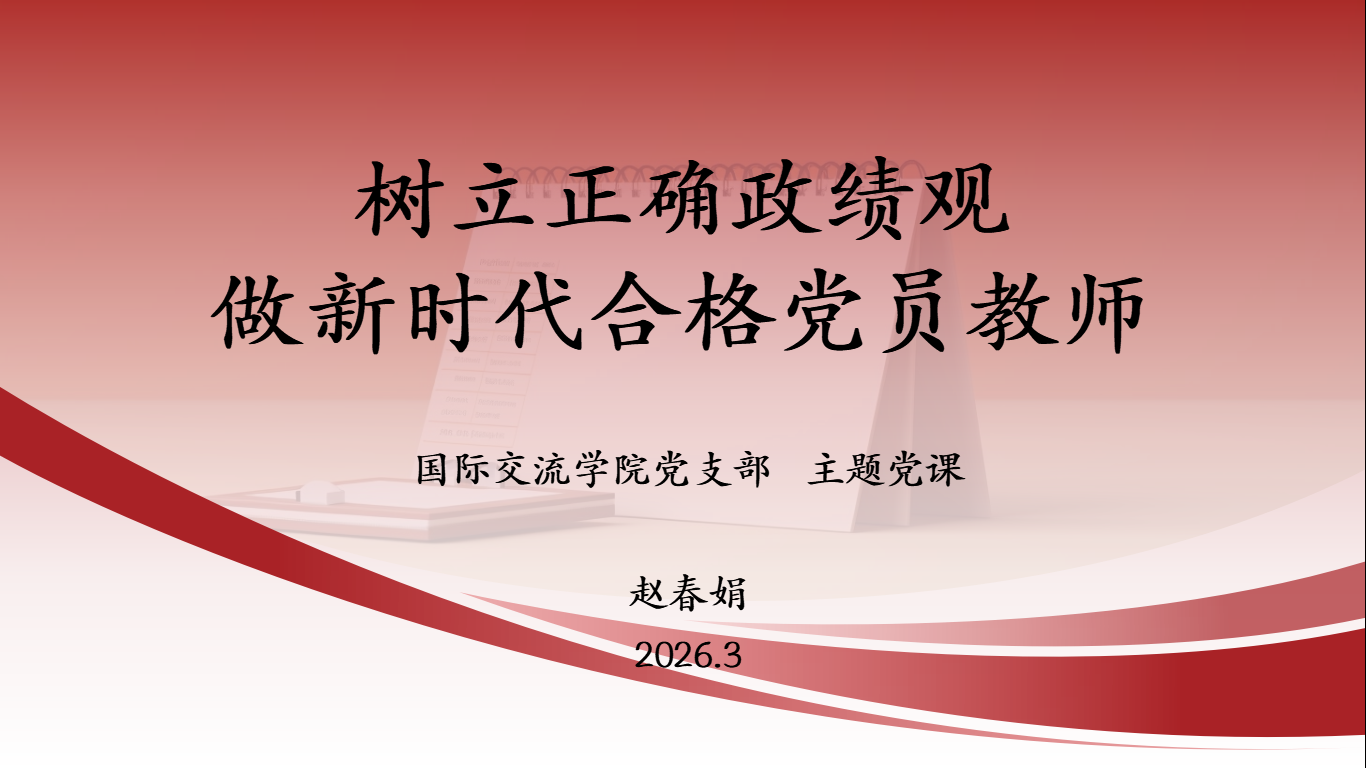 为深化党员教师党性修养,树立和践行正确政绩观,3月17日,国际交流学院党支部召开第一季度专题党课,会议以线上形式进行,党支部书记主持并主讲。党课主题为“树立正确政绩观,做新时代合格党员教师”,全体党员参会学习。