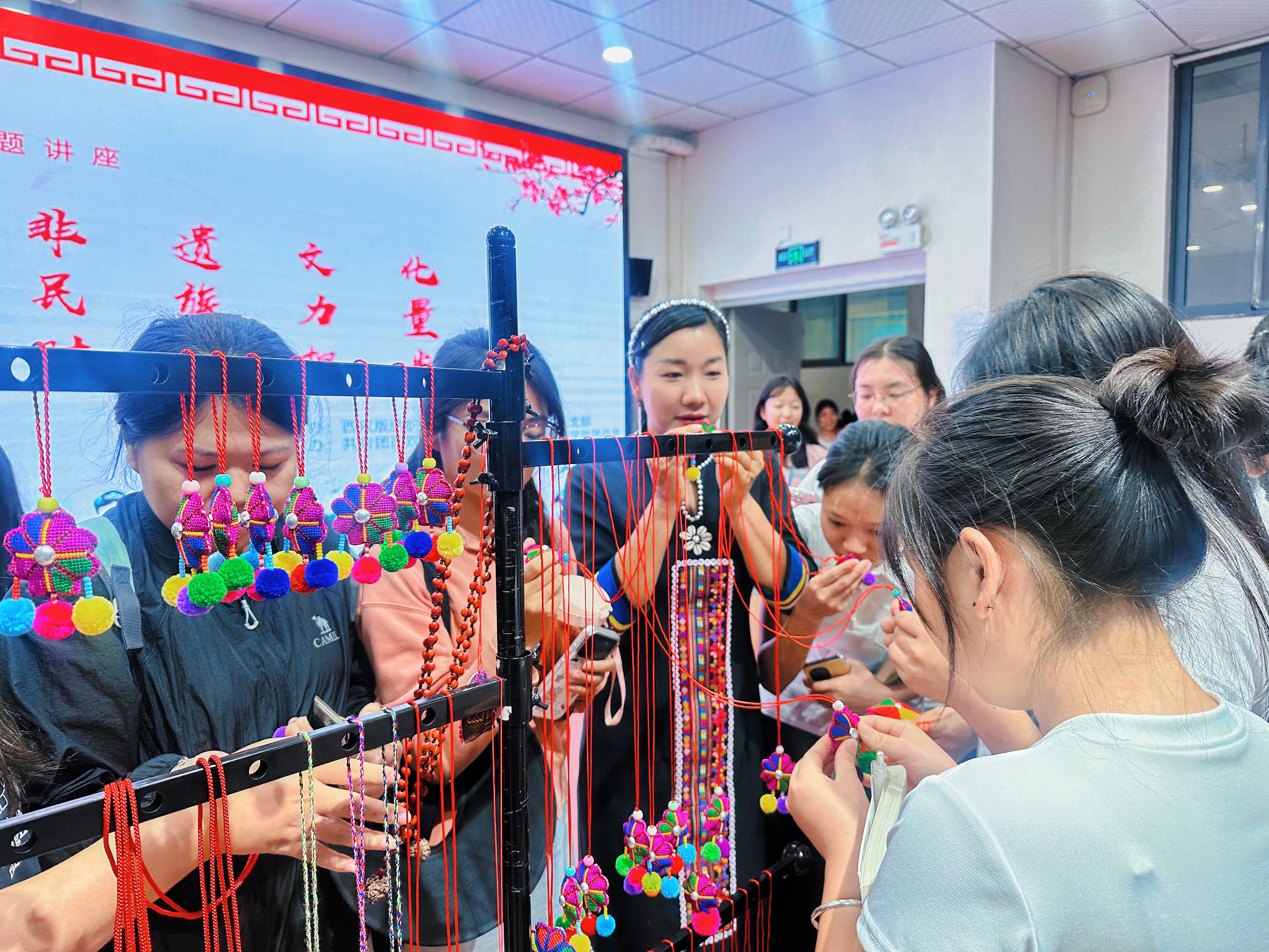 哈尼族非遗专题讲座与互动体验环节是本次活动的一大亮点,让非遗文化从“听说”变为“亲见亲为”。县级哈尼族非遗传承人刘智芳以“哈尼非遗的传承与坚守”为题,结合自身多年的传承经历,生动讲述了哈尼族非遗文化的起源脉络、发展现状及独特价值。她特别分享了哈尼族刺绣中“亢博”的文化密码,细致解读了从古老民俗礼仪中的技艺展示到现代生活中的创意应用,从传承初期面临的“年轻人不愿学”困境到如今“校园传习+电商推广”的新路径,其坚守初心的事迹让在场人员深切感受到非遗传承人的责任与情怀。讲座结束后,互动体验环节开启,在场师生们兴致勃勃地跟随刘智芳老师学习哈尼族传统编织、刺绣技艺,从穿针引线的基础手法到图案搭配的技巧要领,大家反复请教、积极练习,指尖翻飞间,一件件带着温度的简易非遗手作逐渐成型,大家在亲身体验中体悟“慢工出细活”的非遗匠心,深刻感受民族文化的深厚底蕴。