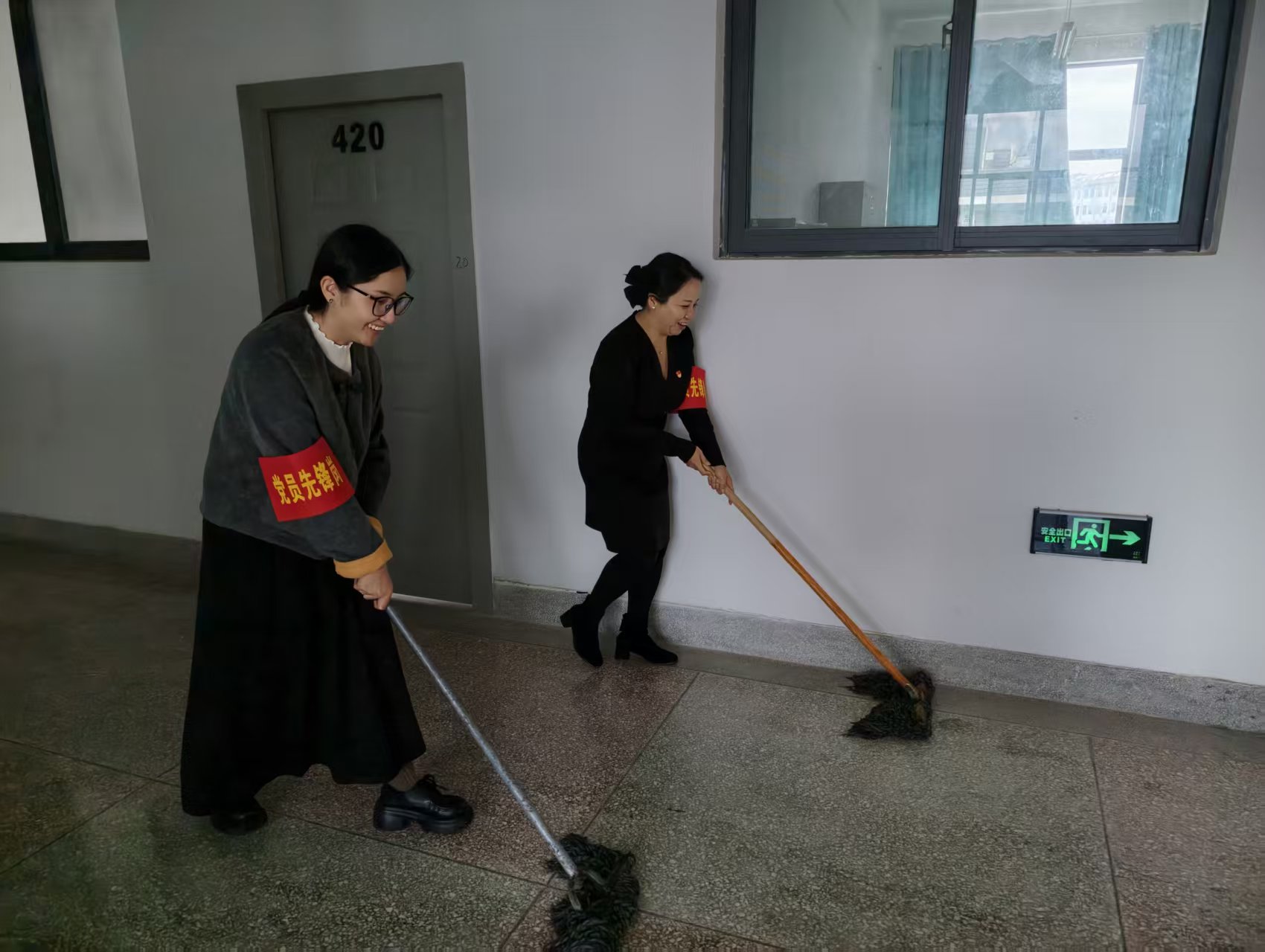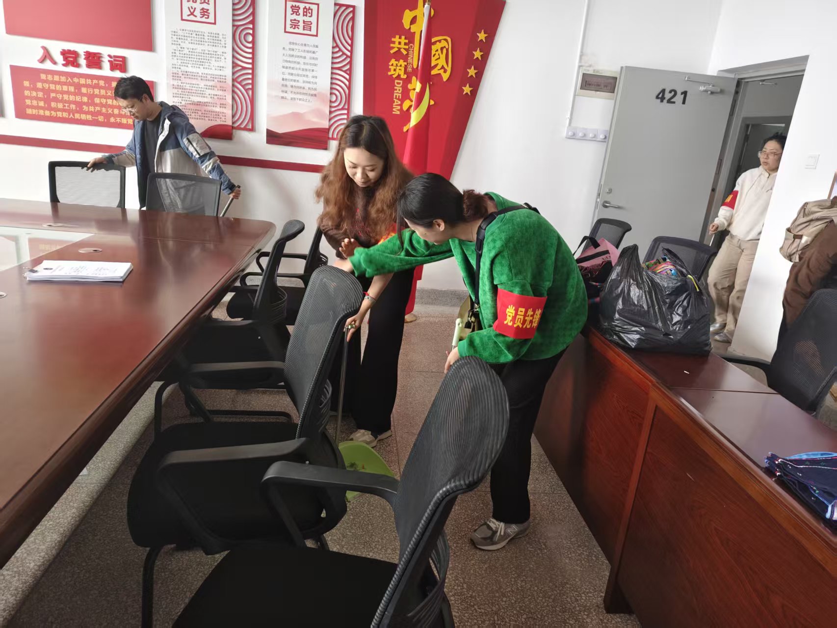 会后,全体党员积极投身校园爱国卫生运动,以实际行动践行初心使命。大家分工协作,对旅财教学楼开展全方位环境卫生整治,彻底清理卫生死角,营造出干净整洁、文明有序的校园环境。