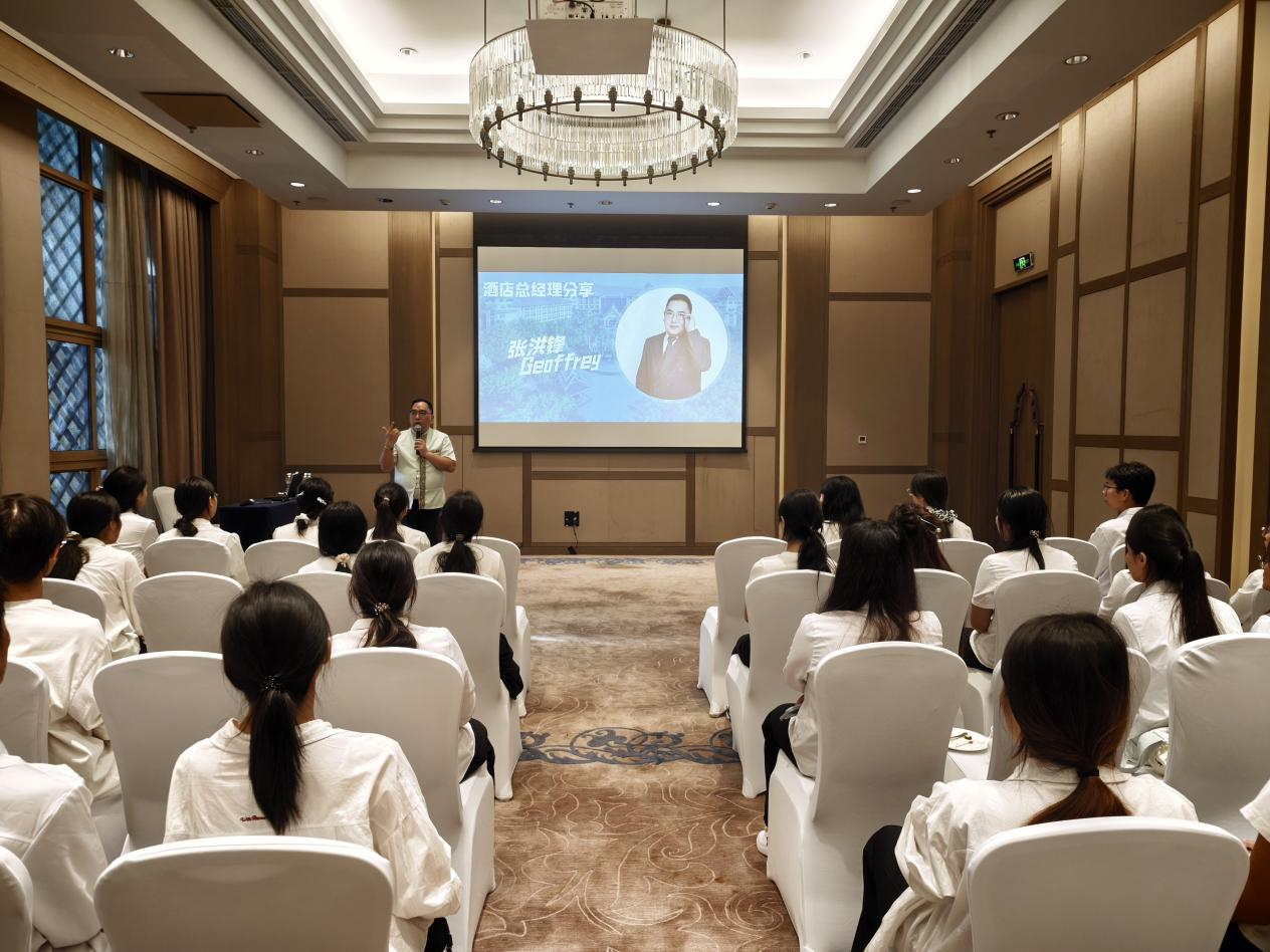 在专题分享环节,酒店总经理张洪峰结合二十余年行业阅历,以“职业生涯规划”为主题开展分享。他指出,当代酒店管理人才须具备“文化理解力、数字应用力、服务创新力”三大核心素养,鼓励同学们在校期间夯实专业基础、拓宽国际视野。茶歇品鉴环节中,同学们进一步体验了高星级酒店的服务细节与待客之道。
