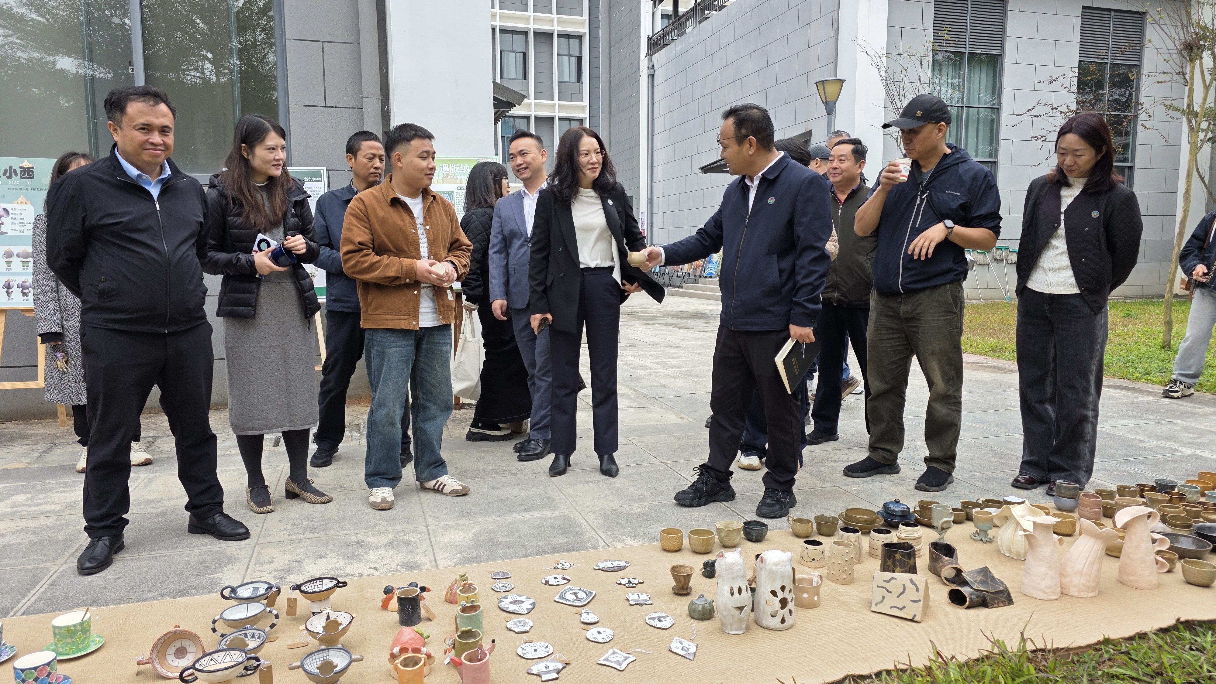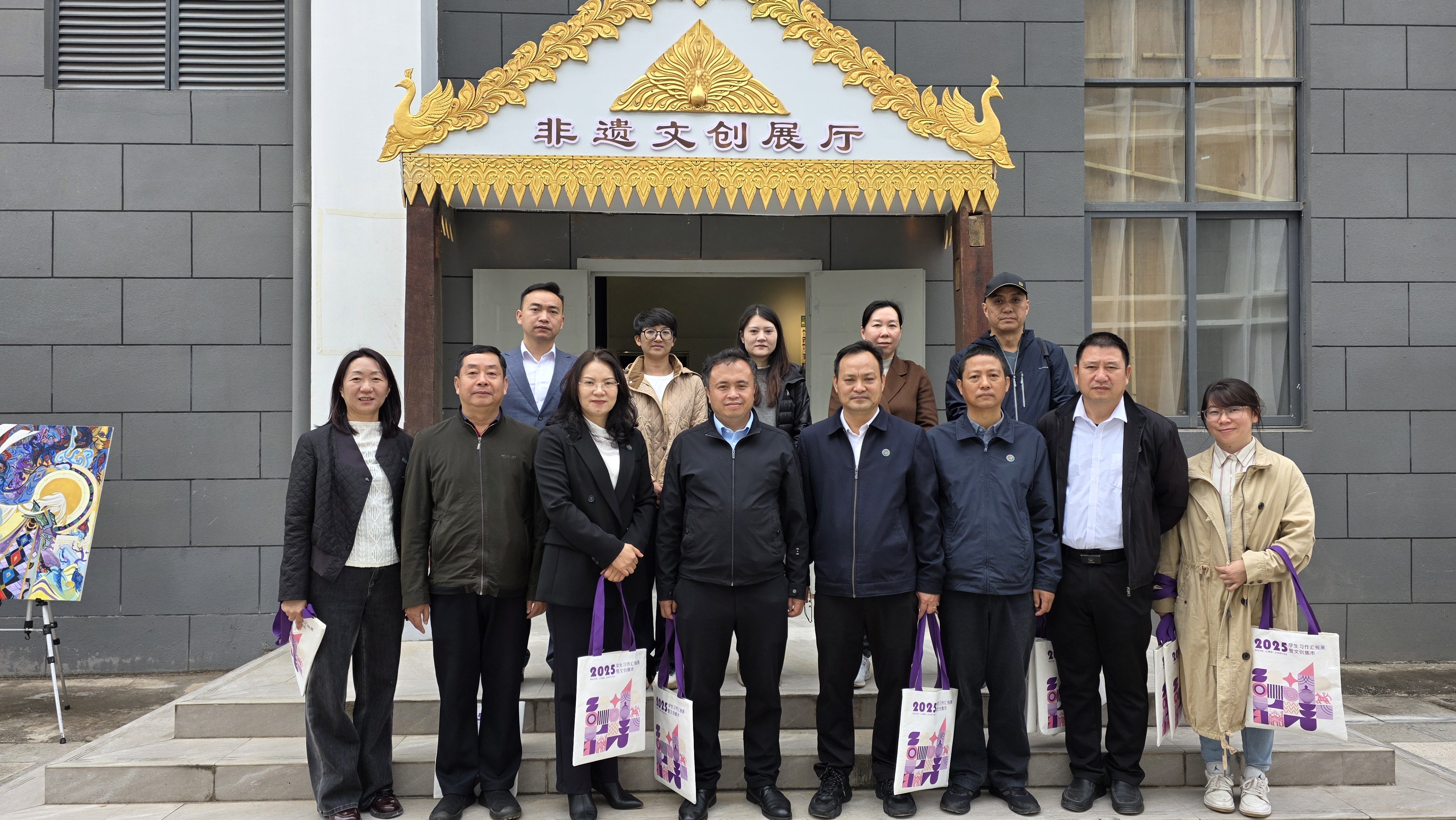 现场最引人注目的,是学子们将傣陶、傣族织锦等少数民族文化元素融入设计的创新实践。他们打造的少数民族形象鲜活灵动,衍生出的冰箱贴、抱枕、手办模型等文创产品兼具实用性与文化感;以校园凤凰花、地涌金莲、特色建筑为灵感的手提袋、茶袋盲盒等作品,更让观展师生眼前一亮,尽显青春创意与生活温度。非遗传承人与学子们现场交流技艺、点拨思路,让传承脉络在互动中延续,也让铸牢中华民族共同体意识的种子在实践中扎根。
