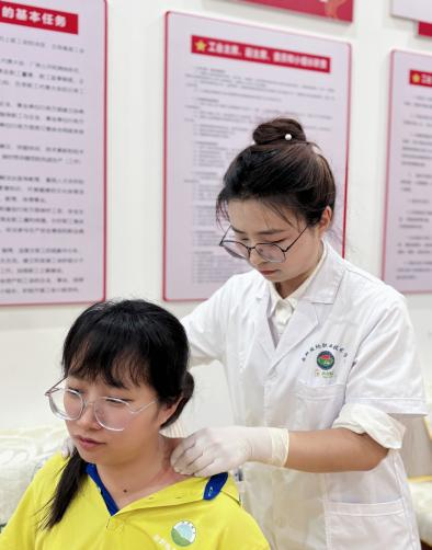 宣讲结束后,医学院李娜、陆蕊老师带领学生充分发挥专业优势,在企业休息区为一线员工开展公益康复理疗服务,获得企业员工广泛认可。服务过程中,师生还与企业员工亲切交流,传递健康理念,展现了医学院服务社会、奉献基层的责任担当。