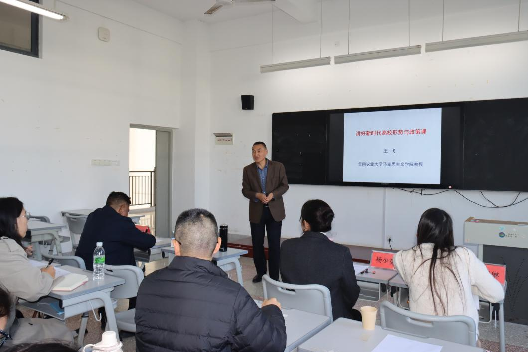 本次备课会特邀云南农业大学马克思主义学院王飞教授作专题辅导。王教授以《新时代讲好高校形势与政策课》为题,结合多年教学研究与实践经验,为在场教师带来了一场内容丰富、针对性强的教学指导。