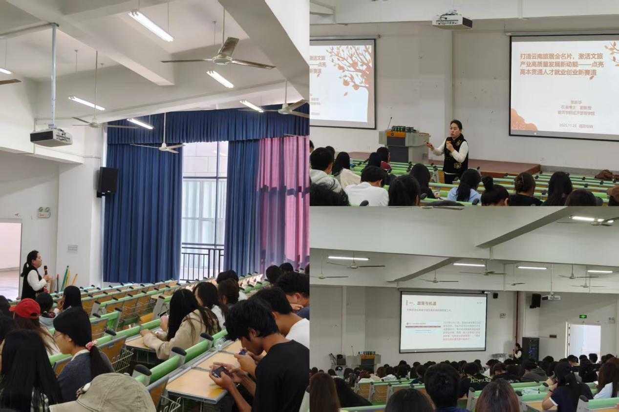 西双版纳州旅游行业协会副会长兼秘书长窦娟作“西双版纳文旅资源介绍”专题分享,结合自身跨界经历与地方文旅建设实践,详细介绍了当地自然景观、民族文化、傣医药等特色资源,为学生们挖掘本地文旅融合切入点提供新思路。