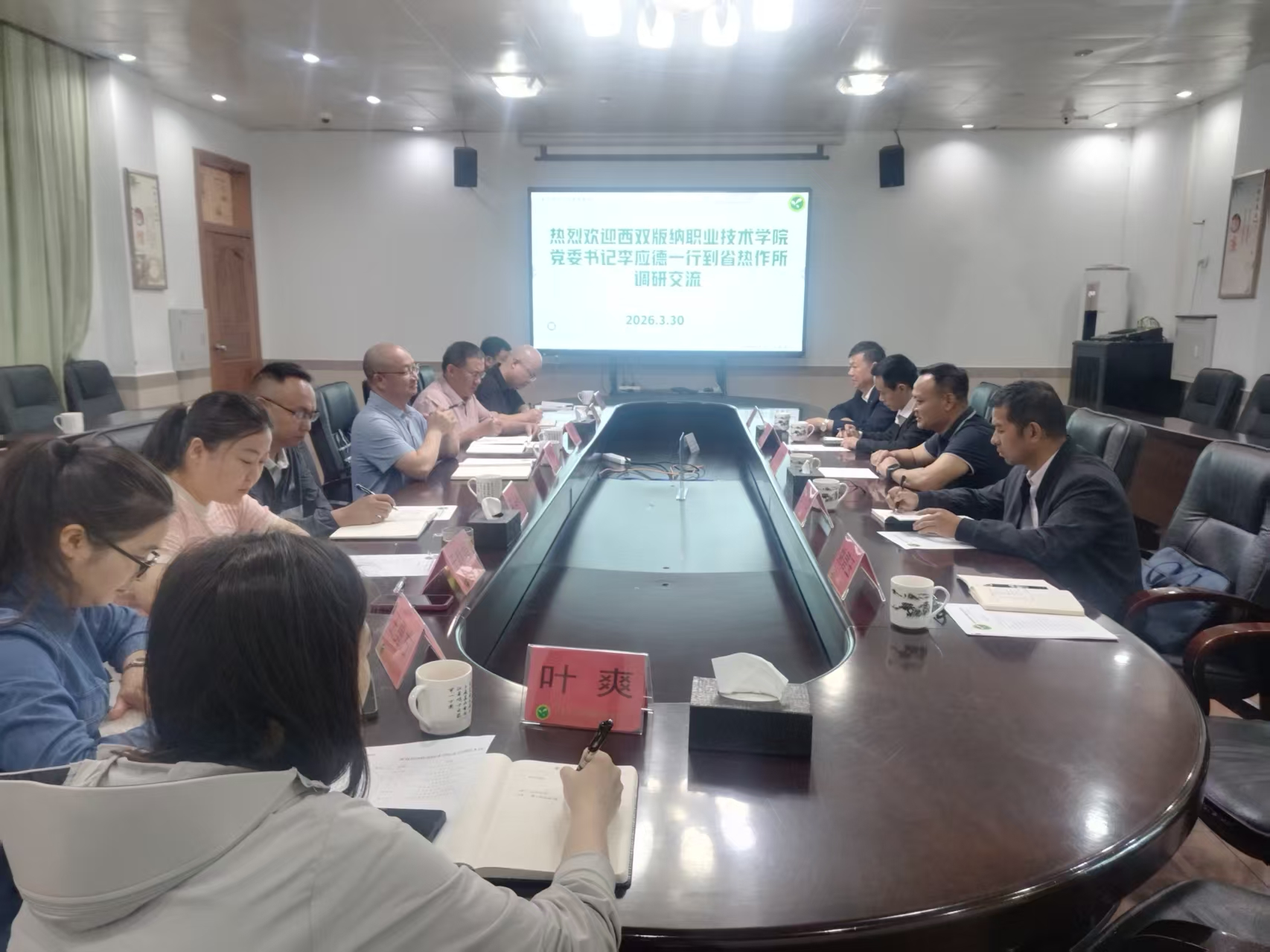 为搭建“产学研用”合作平台,推动高职教育与科研创新深度融合、人才培养精准对接我州“4+6”产业集群发展需求,2026年3月30日,学院党委书记李应德率科研科、教务科、实验实训中心及生命科学学院负责人,赴云南热带作物科学研究所、云南天然橡胶产业研究院开展专项调研与合作洽谈。