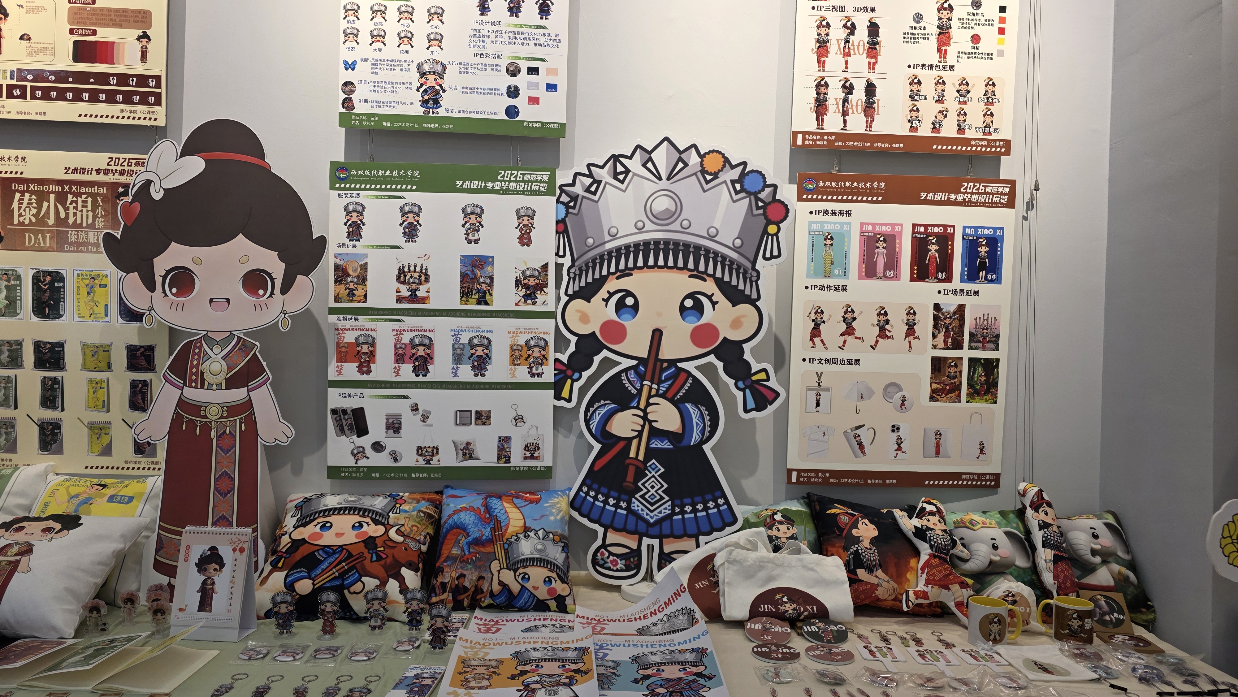 现场最引人注目的,是学子们将傣陶、傣族织锦等少数民族文化元素融入设计的创新实践。他们打造的少数民族形象鲜活灵动,衍生出的冰箱贴、抱枕、手办模型等文创产品兼具实用性与文化感;以校园凤凰花、地涌金莲、特色建筑为灵感的手提袋、茶袋盲盒等作品,更让观展师生眼前一亮,尽显青春创意与生活温度。非遗传承人与学子们现场交流技艺、点拨思路,让传承脉络在互动中延续,也让铸牢中华民族共同体意识的种子在实践中扎根。