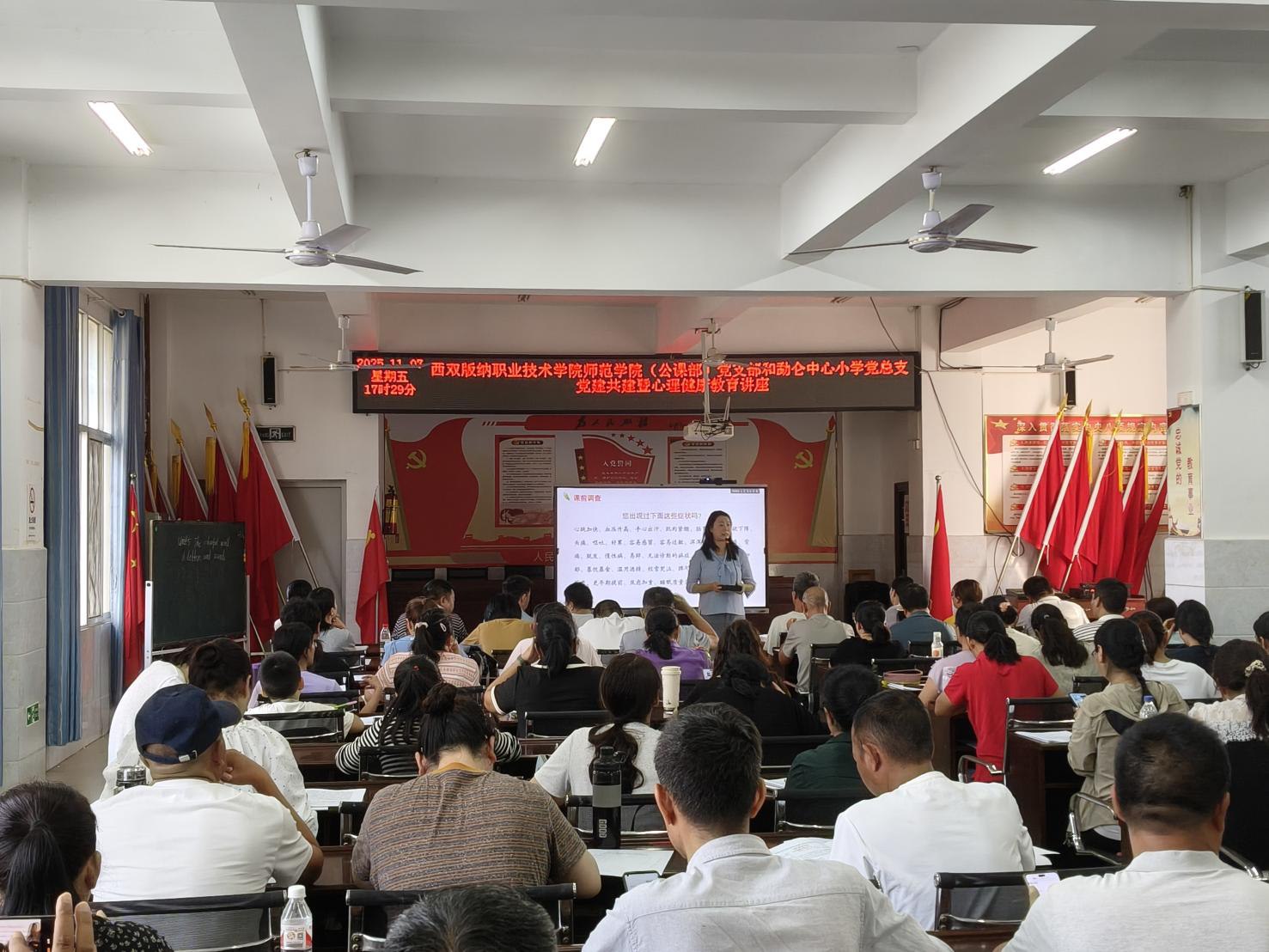 2025年11月7日,师范学院(公课部)党支部以 “发挥专业优势、服务基础教育” 为宗旨,组织心理健康教育骨干教师,赴勐仑中心小学开展心理健康教育专题社会服务,为该校 125名一线教师送上精准化、实用性的心理赋能培训。?