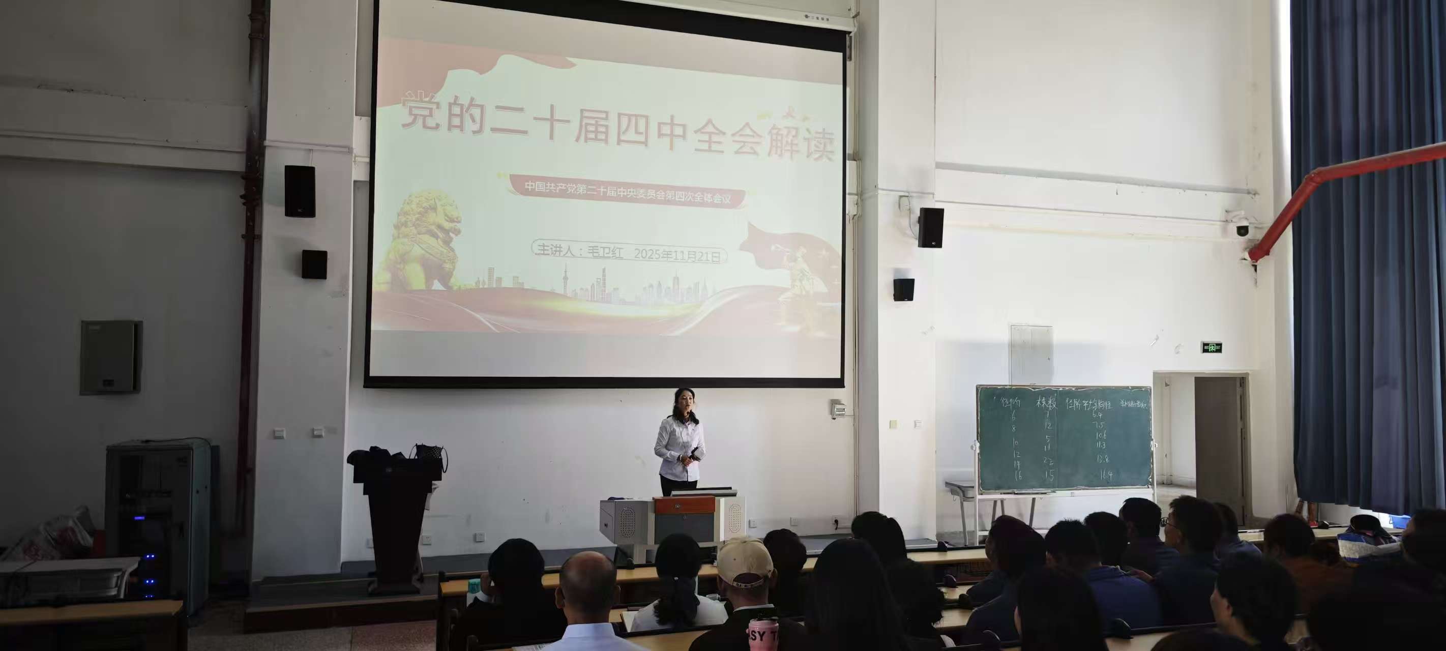 2025年11月21日,西双版纳职业技术学院医学院党支部与中等职业教育中心党支部在西区教学楼104教室联合开展了“党的二十届四中全会精神解读”专题党课,由学院党委委员、副院长毛卫红主讲,医学院全体教职工、入党积极分子、部分学生团员以及中等职业教育中心全体教职工共同参与。