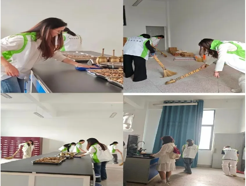 此次卫生清扫志愿服务活动在医学院K1、K4栋实训室展开。活动现场,志愿者们准时集结、分工明确。在专业老师指导下,大家有序开展清洁工作:擦拭实验台、整理中药标本与器械物品、清洁实训设备、清扫地面与卫生死角、规范摆放药材与工具。每一处台面、每一台仪器、每一个角落都认真对待,不留污渍、不留隐患,用医学生的严谨守护实训安全。