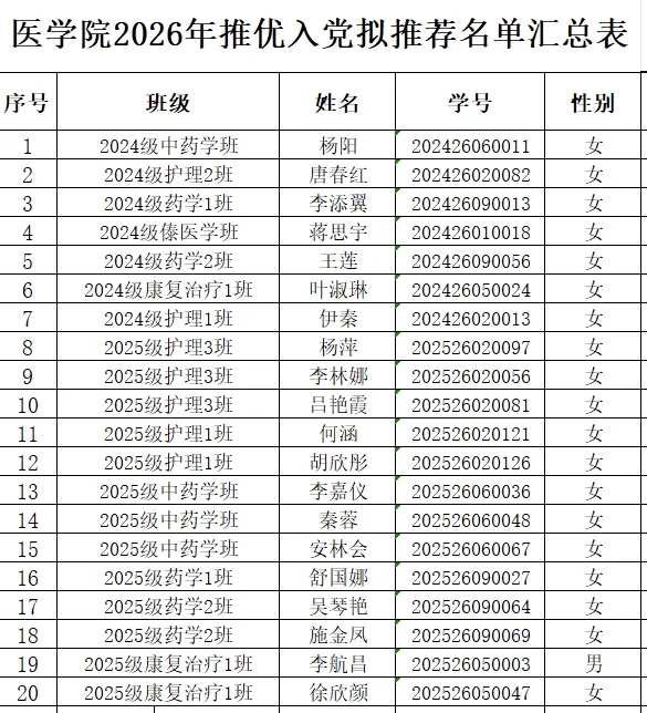 根据《中国共产党章程》《中国共产主义青年团章程》《中国共产党发展党员工作细则》《共青团推优入党工作实施办法(试行)》规定以及学院团委关于开展2026年上半年推优入党工作的要求,经个人申请、团支部推荐、班主任/辅导员考察批准,医学院团总支综合审查,拟推荐杨阳等20名同志为入党积极分子,现将名单公示如下:
